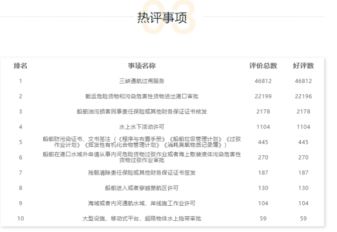 “三峡通航过闸服务”稳居部政务服务“好差评”系统热评第一